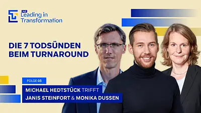 Warum jede dieser Verfehlungen in einem Turnaround potenziell gravierende Folgen nach sich ziehen kann – aber auch, wie man sie vermeidet und es besser macht, darüber sprechen in dieser Folge von SMP Leading in Transformation Janis Steinfort und Michael Hedtstück mit der erfahrenen Saniererin Monika Dussen.